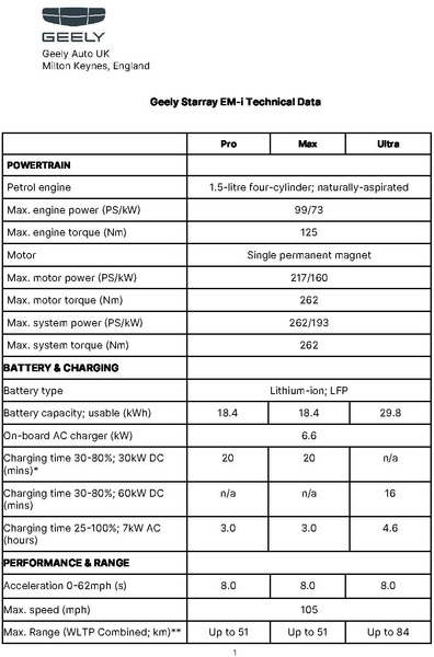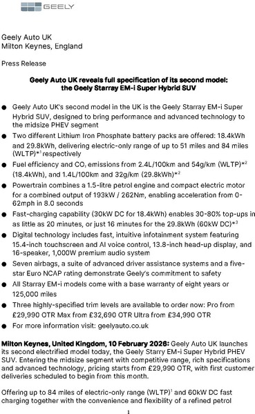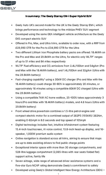 - Geely Auto UK’s second model in the UK is the Geely Starray EM-i Super Hybrid SUV, designed to bring performance and advanced technology to the midsize PHEV segment