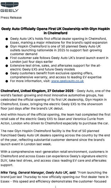 Chelmsford, United Kingdom, 27 October 2025 – Geely Auto, one of the world’s fastest-growing and most innovative automotive groups, has celebrated the official opening of its first UK dealership, Glyn Hopkin in Chelmsford, Essex, bringing the electric Geely EX5 to the showroom floor just days after the brand’s UK debut.