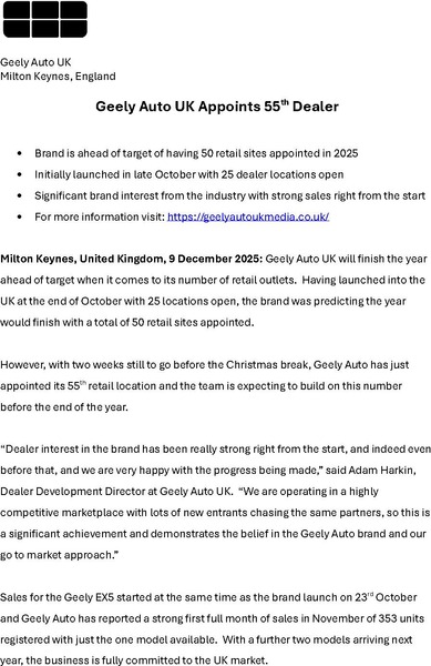 Milton Keynes, United Kingdom, 9 December 2025: Geely Auto UK will finish the year ahead of target when it comes to its number of retail outlets. Having launched into the UK at the end of October with 25 locations open, the brand was predicting the year would finish with a total of 50 retail sites appointed.